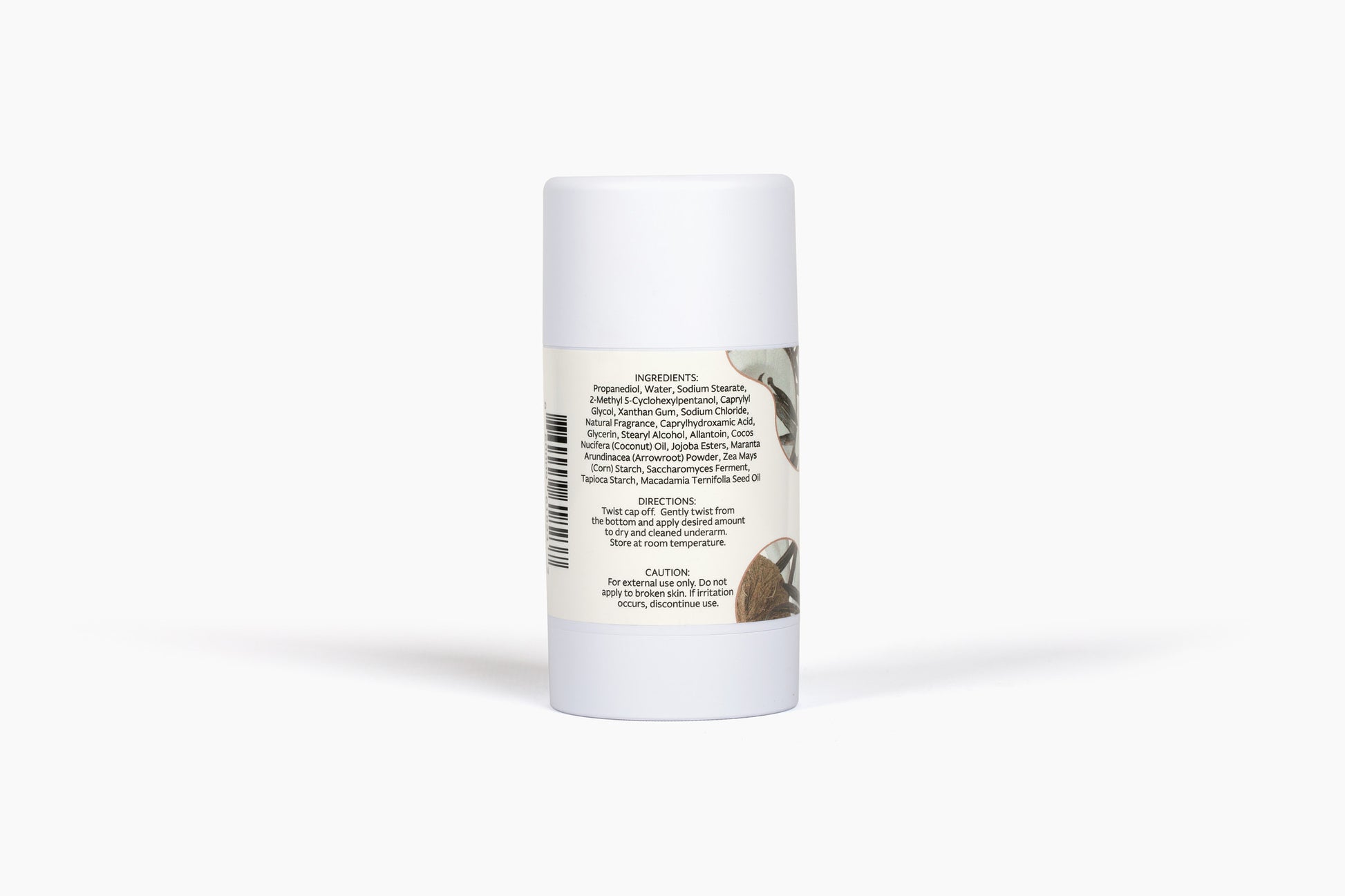 Propanediol, Water, Sodium Stearate, 2-Methyl 5-Cyclohexylpentanol, Caprylyl Glycol, Xanthan Gum, Sodium Chloride, Natural Fragrance, Caprylhydroxamic Acid, Glycerin, Stearyl Alcohol, Allantoin, Cocos Nucifera (Coconut) Oil, Jojoba Esters, Maranta Arundinacea (Arrowroot) Powder, Zea Mays (Corn) Starch, Saccharomyces Ferment, Tapioca Starch, Macadamia Ternifolia Seed Oil